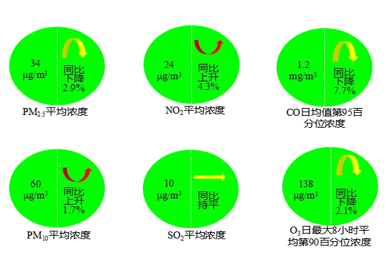 1-6月,全国339个地级及以上城市平均优良天数比例为84.3%,同比下降0.7个百分点;PM2.5平均浓度为34微克/立方米,同比下降2.9%;PM10平均浓度为60微克/立方米,同比上升1.7%;O3平均浓度为138微克/立方米,同比下降2.1%;SO2平均浓度为10微克/立方米,同比持平;NO2平均浓度为24微克/立方米,同比上升4.3%;CO平均浓度为1.2毫克/立方米,同比下降7.7%。