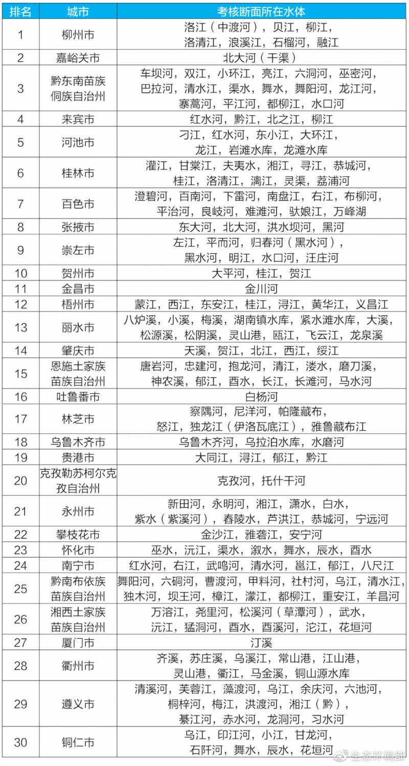2021年1-6月国家地表水考核断面水环境质量状况排名前30位城市及所在水体