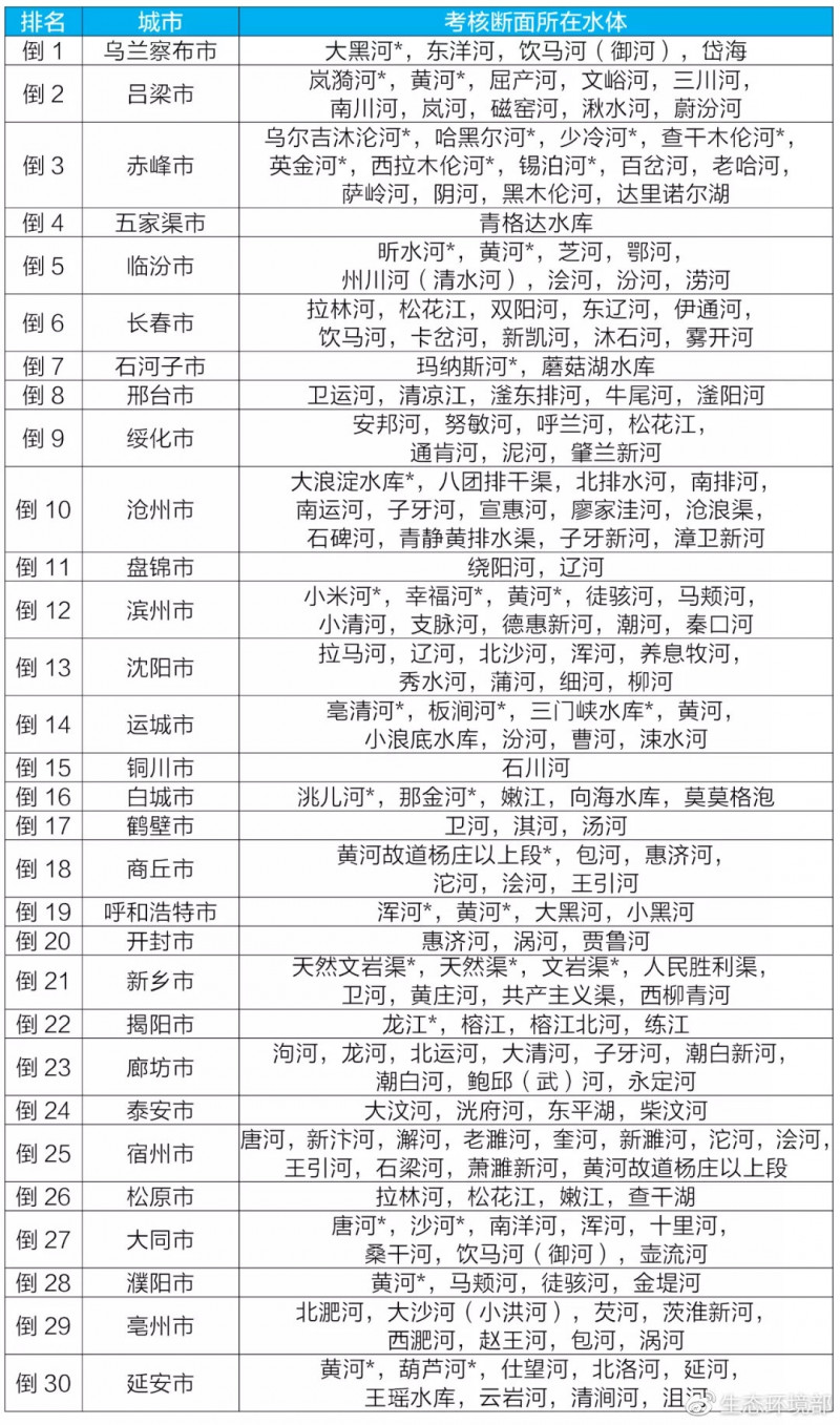 2021年1-6月国家地表水考核断面水环境质量状况排名后30位城市及所在水体
