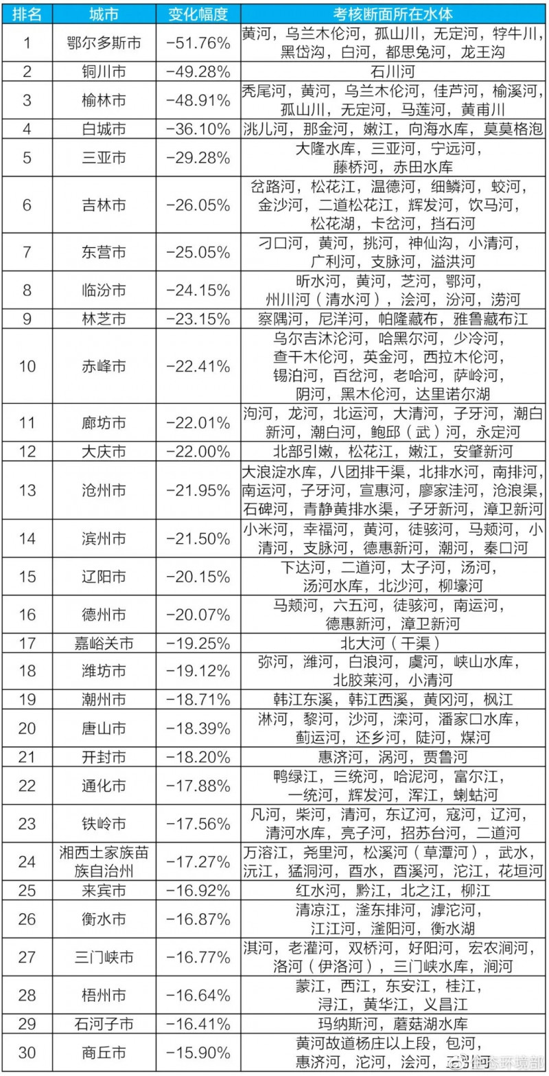 2021年1-6月国家地表水考核断面水环境质量变化情况排名前30位城市及所在水体