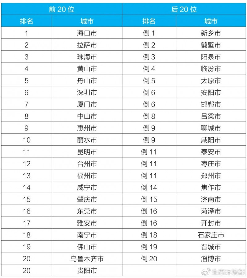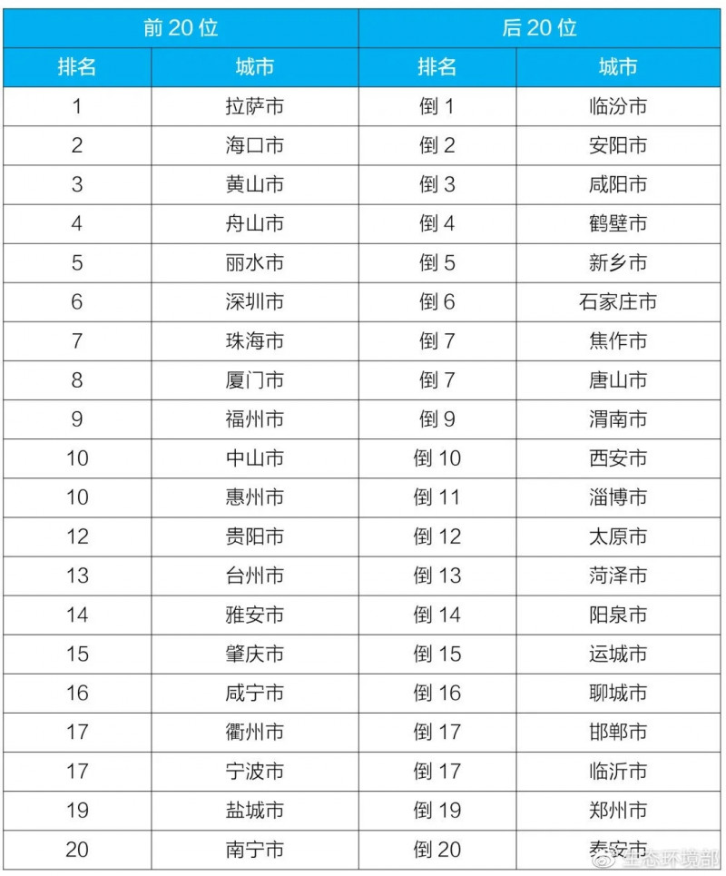 2021年6月168个重点城市空气质量排名前20位和后20位城市名单
