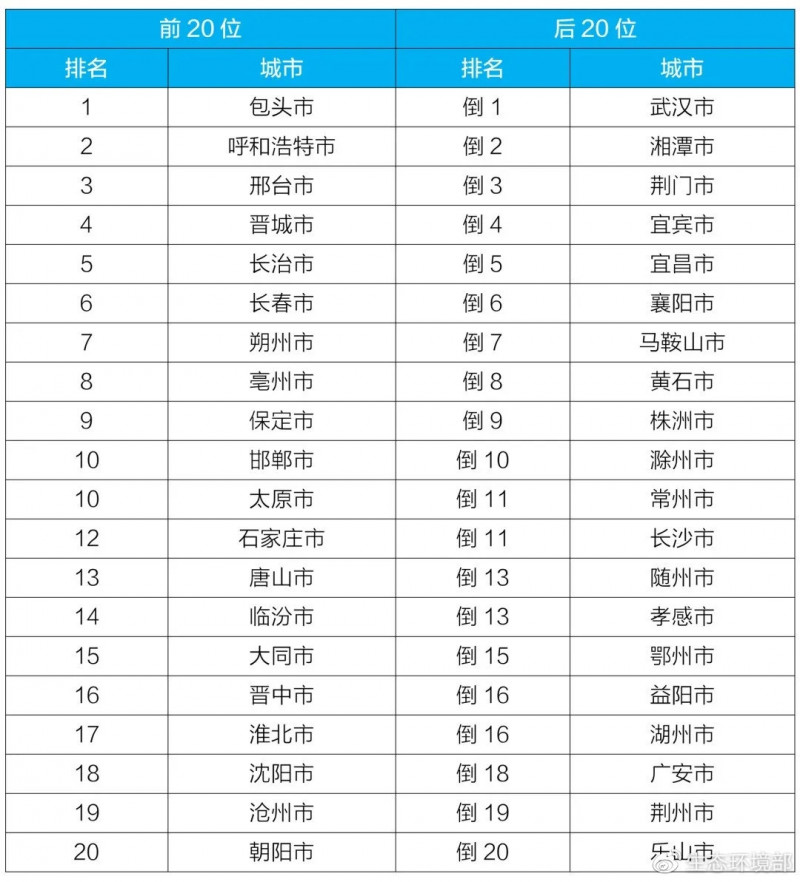 2021年1-6月168个重点城市空气质量排名前20位和后20位城市名单