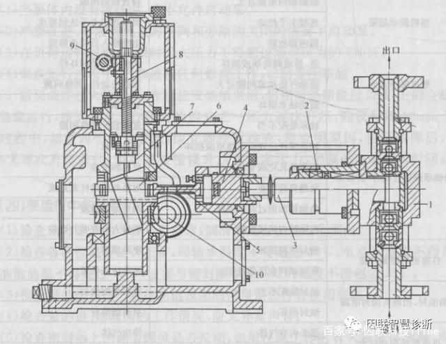 1—泵缸;2—填料.html'>填料箱;3—柱塞;4—十字头;5—连杆;6—偏心套;7—N型曲轴;8—调节螺杆;9—调节用蜗轮蜗杆;10—传动用蜗轮蜗杆
