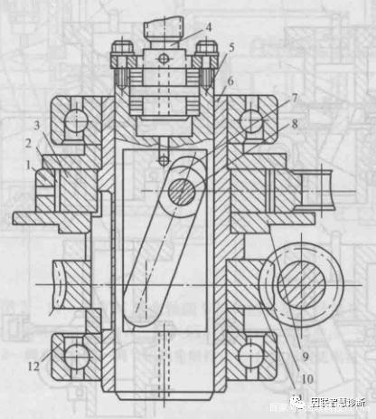 1—连杆;2—轴瓦;3—偏心轮;4—调节杆;5—斜槽轴;6—斜槽轴套;7—销套;8—圆柱销;9—支承环;10—蜗轮;11—蜗杆;12—角接触球轴承