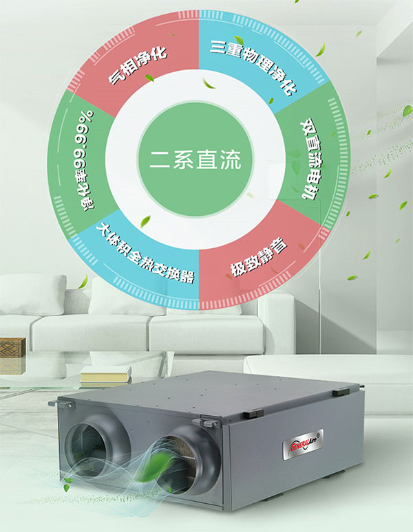 这时,如果新风系统结合空调一起使用,就可以有效避免以上情况的产生。新风系统是根据在密闭的室内通过新风管道向室内送新风,再从另一侧由专用排风管道将室内污浊空气排出,形成“新风流动场”的原理,从而满足室内新风换气的需要。通过新风系统引进来的空气不仅经过过滤净化的处理,搭载的热交换芯体还能回收空气中的温度及湿度的能量,实现恒温、恒氧、恒湿的效果,人在这种环境下呼吸就会非常舒适健康,有效避免“空调病”侵袭。