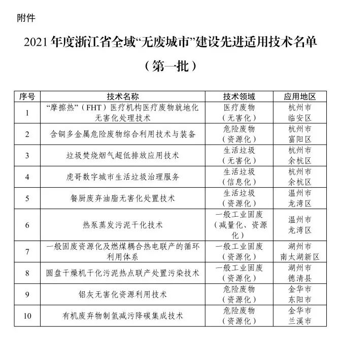 附件:2021年度浙江省全域“无废城市”建设先进适用技术名单(第一批)