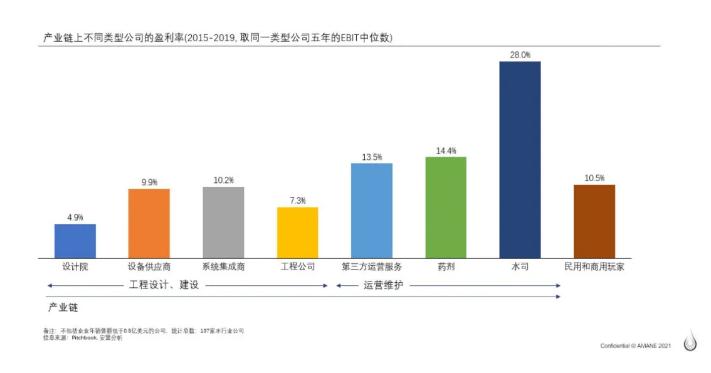药剂和设备供应商也呈现出了相对较好的盈利能力和投资回报率;对于水司而言,虽然投资回报率较高达7.1%,但盈利能力属于业内平均水平,这也与水司需要不断的资金投入从而推动营收的机制相关。