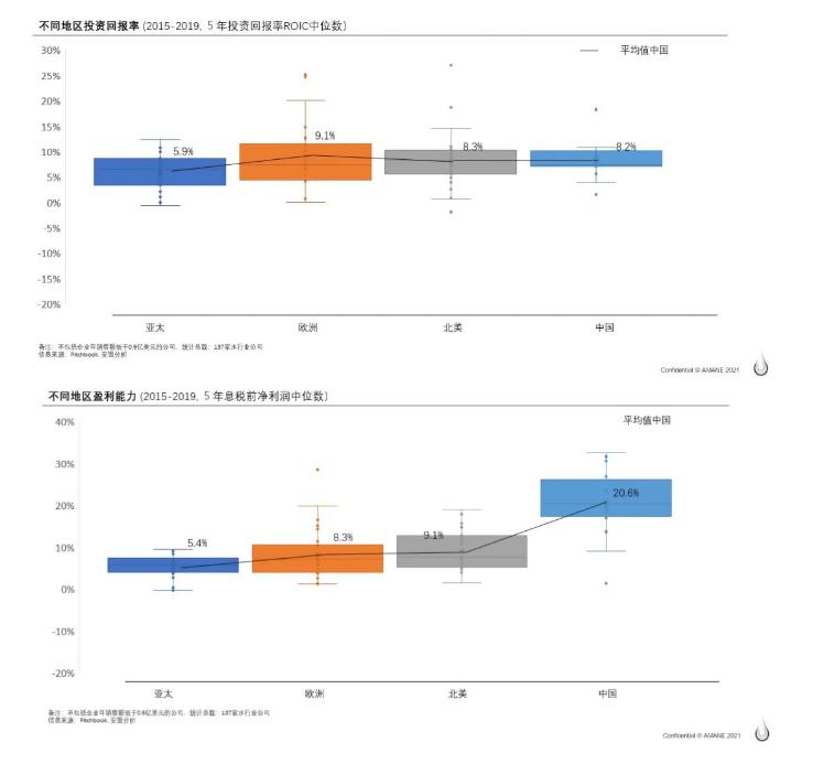5. 中国公司的平均五年EBIT最高,且投资回报率与欧美成熟水市场持平