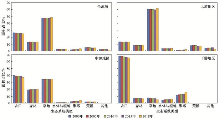 黄河流域生态系统类型以草地生态系统、农田生态系统和森林生态系统为主,2018年三者面积占全流域面积的比例分别为48.35%、25.08%和13.46%,其中草地在中上游地区广泛分布;农田主要分布在上游的宁夏平原、河套平原,中游的汾渭平原和下游地区;森林主要分布在中上游的山区(见图 1)。2000—2018年,流域内农田生态系统面积占比持续下降,森林、水域面积占比略有增加,草地面积占比先降后升;聚落面积占比持续上升,从2000年的2.20%增至2018年的3.57%(见图 2)。