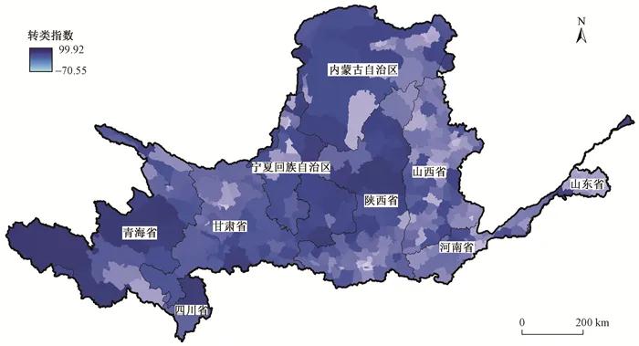 黄河流域上游地区以草地生态系统为主,面积占比约为60%;中游地区以农田、草地和森林生态系统为主;下游地区以农田生态系统为主,面积占比超过65%。 2000—2018年,上游地区农田、荒漠生态系统面积略有下降,森林、草地、水域、聚落面积增加;中游地区农田面积下降明显,聚落面积持续增加,其他类型面积较为稳定;下游地区农田、草地面积持续下降,水域、聚落面积稳定增加。根据邵全琴等提出的土地覆被转类指数计算方法,得到黄河流域2000—2018年县域尺度的生态系统转类指数,结果显示,流域西部和中部地区转类指数高于东部地区,青海省生态系统状况转好趋势显著,河南省、山西省生态系统状况以转差趋势为主(见图 3)。