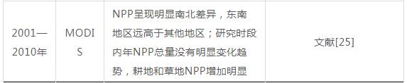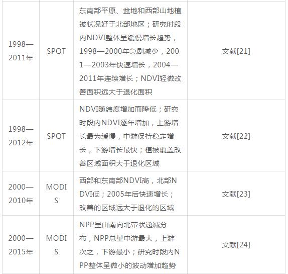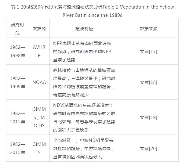 植被是敏感的环境变化指示器,能直观地反映生态系统的状况和变化。受日照、降水等气象条件和地形条件影响,黄河流域植被覆盖度表现出由东南向西北递减的趋势。20世纪80年代以来,黄河流域植被覆盖度整体表现出增长趋势,由于数据源、研究时段和分析手段的不同,各研究结果存在时空上的差异,但大部分研究认为流域内植被覆盖度和NPP增加的区域面积大于减少的区域面积,流域整体植被状况得到改善(见表 1)。从时间变化上看,黄河流域植被覆盖度变化可以分为3个阶段:20世纪80年代至90年代末总体上表现出增加趋势,20世纪90年代末至21世纪初期植被覆盖度波动较大,2004年后植被覆盖度持续增长. 黄河流域的局部地区或个别年份也存在植被退化现象,例如,在一些不易开展生态保护和建设的干旱、高寒地区,植被覆盖受干旱气候影响呈下降趋势,也有研究认为2000—2010年整个流域27.7%的区域表现出植被退化趋势,24.5%的区域植被持续退化,14%的区域无法确定植被的变化趋势。