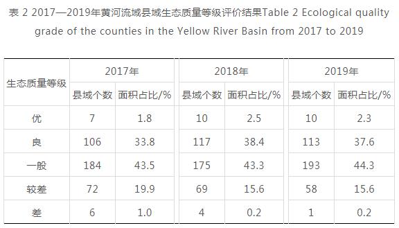 2017—2019年,黄河流域生态质量呈“优“良”和“一般”的县域个数呈增加趋势,“优”和“良”的面积占比呈增加趋势,“一般”的面积占比保持稳定,“较差”和“差”的面积占比呈下降趋势(见表 2)。