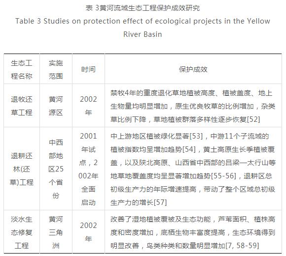为遏制黄河流域生态恶化态势,我国先后启动了小流域治理、水土保持、天然林保护、退牧还草、退耕还林(还草)、坡耕地整治、湿地保护等生态保护和修复工程,经过数十年的建设,工程的实施为提高区域植被覆盖面积、提升生态系统功能、保护湿地生物多样性做出了重要贡献(见表 3)。20世纪90年代黄河流域气候相对干燥,不利于植被生长,但是植被覆盖度总体处于上升趋势,这与植树造林、水土流失治理等生态保护和建设工作的开展密不可分。