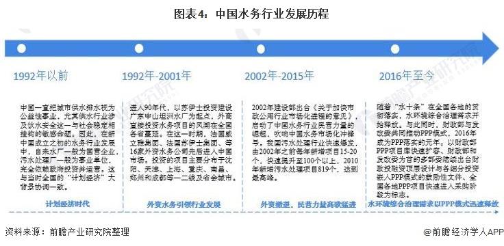 建国以来,我国水务行业经历了四个发展阶段,1992年之前基本为计划经济时代,在1992-2001年开始引入外资水务企业,2002-2015年期间民营企业开始参与竞争,2016年后行业需求猛增,竞争加剧,以PPP模式开始了行业高速发展阶段。