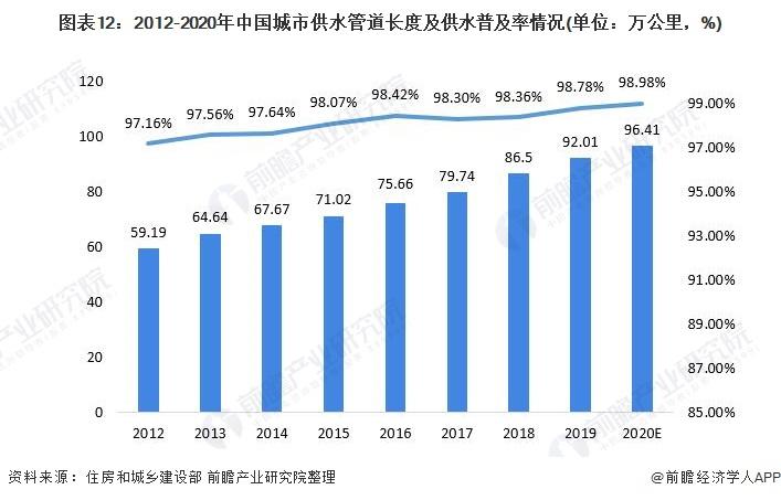 我国供水市场进入平稳发展状态得益于近年来我国供水管道长度及供水普及率的逐年增长。2019年我国城市供水管道长度达92.01万公里,供水普及率达98.78%。