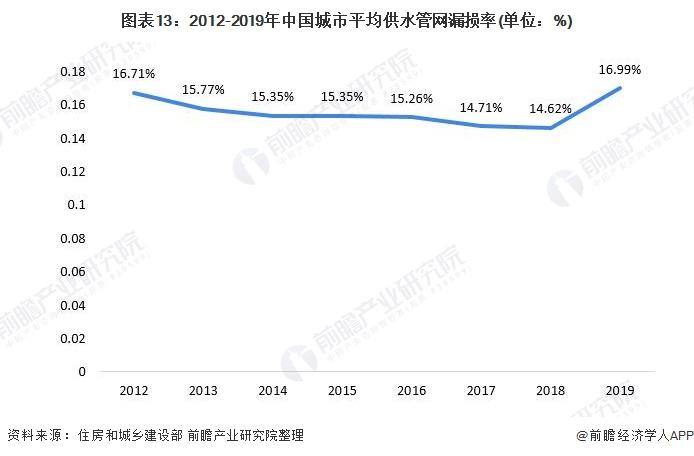 在供水能力持续增长的同时,我国供水管网漏损率仍处于较高水平。2012-2018年,我国城市供水管网漏损率从16.71%下降至14.62%。2019年,我国供水管网漏损率小幅上升,增至16.99%。