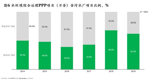 此外,我们也看到,越来越多的单一污水项目逐渐融入到水环境综合治理及长江、黄河的流域保护治理中,尤其是2017年PPP清库开始后,含有污水厂建设运营的水环境综合治理项目占比明显增加,相比2017年之前的不到50%,2018、2019连续两年这一比重都超过60%(见图6)。