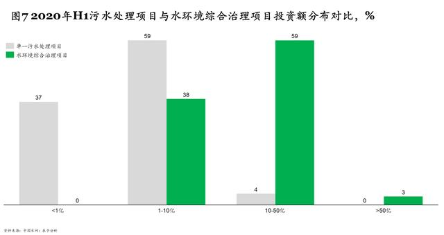 随着单一污水处理项目转向水环境综合治理项目,项目体量也在成倍增加(见图7)。例如,2020年上半年的水环境综合治理项目中,有59%的投资额处于10-50亿之间,3%的投资额在50亿元以上,而单一的污水处理项目投资额大多在10亿元以下,其中小于1亿元和1-10亿元之间的分别占到了37%和59%。