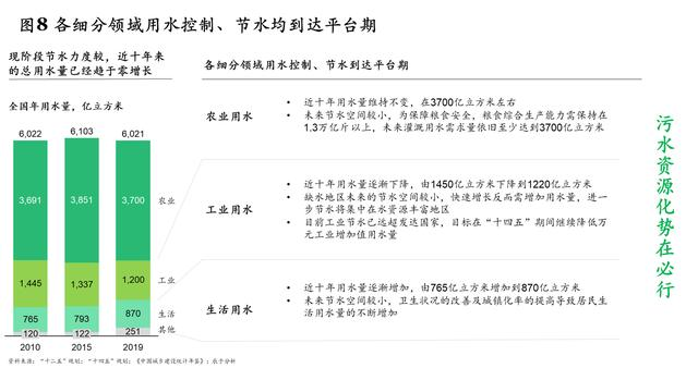 一是南水北调超规划、用水控制到达平台期,污水资源化需求释放。截至2018年底,中线调水超155亿立方米,京津地区调水量已超规划,新的解决方案已提上日程;用水控制方面,各细分领域均到达平台期,未来节水空间较小,以农业用水为例,近十年其用水量基本维持不变,在3700亿立方米左右,而为保障粮食安全,粮食综合生产能力需保持在1.3万亿斤以上,对应的灌溉用水需求量至少应达到3700亿立方米(见图8)。