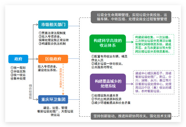重庆市坚持基础设施建设与城市规划高度融合,按照协同化、区域化原则科学构建餐厨垃圾收运处理系统,实现餐厨垃圾处置基础设施共建共享,最大限度节约土地资源和投资,减少环境敏感点和社会矛盾,充分实现了生态环境、经济、社会等综合效益。市城市管理局牵头会同市规自局、市发改委制定《主城区餐厨垃圾收运处理系统建设方案》(2011—2020年)和《统筹规划建设五大功能区餐厨垃圾收运处理系统实施方案》(2014—2020年)。中心城区各区政府负责餐厨垃圾收运系统建设运管,市政府授权市环卫集团负责餐厨垃圾处理厂建设运营,市财政负责解决运营资金,确保餐厨垃圾收运处理工作正常开展。主城以外区县,各区县政府为责任主体,负责建设运营餐厨垃圾收运处理系统,市环卫集团协助区县开展餐厨垃圾收运处理。