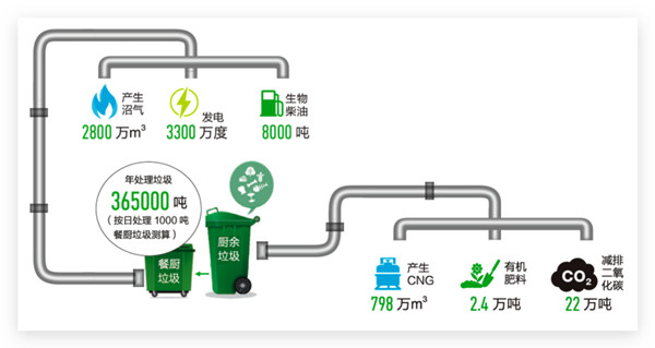 (三)实现餐厨垃圾高效资源化利用。通过配套现代化的餐厨垃圾资源化利用和无害化综合处理系统,成功构建餐厨垃圾资源化利用产业链:餐厨垃圾厌氧消化产生的沼气除为餐厨垃圾处理厂提供热能外,富余的沼气还可用于发电上网,有效减少温室气体排放;残渣可制成有机肥料;所含油脂提炼加工生物柴油,实现餐厨垃圾变废为宝。