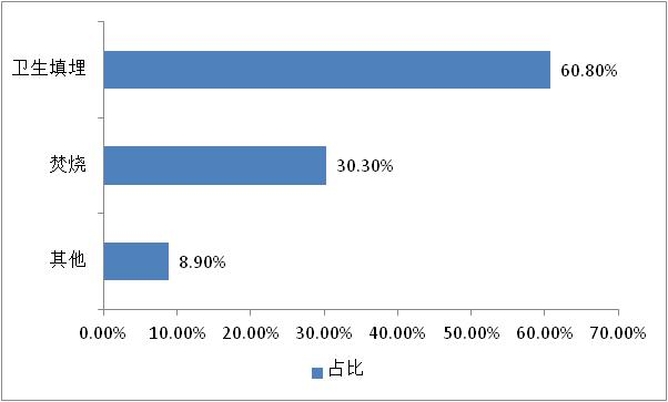 我国生活垃圾无害化处理的方式主要有三种:卫生填埋、焚烧和其他,目前仍以卫生填埋为主。据住建部发布的《2019中国城市建设统计年鉴》,2019年生活垃圾卫生填埋663万吨,占据了我国生活垃圾处理的60.8%;其次是生活垃圾焚烧处理331万吨,占30.3%。