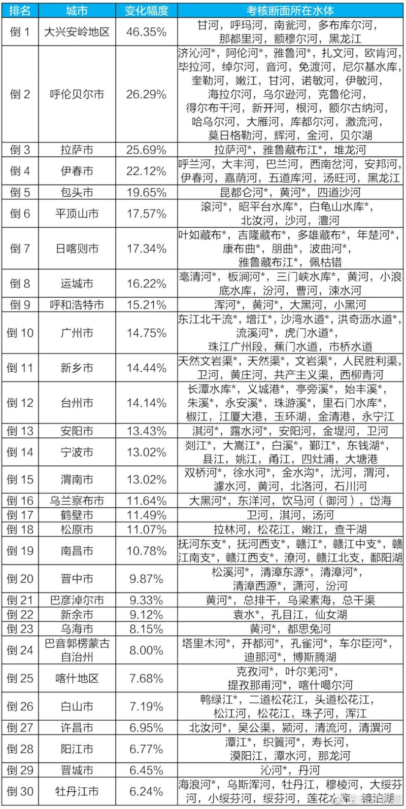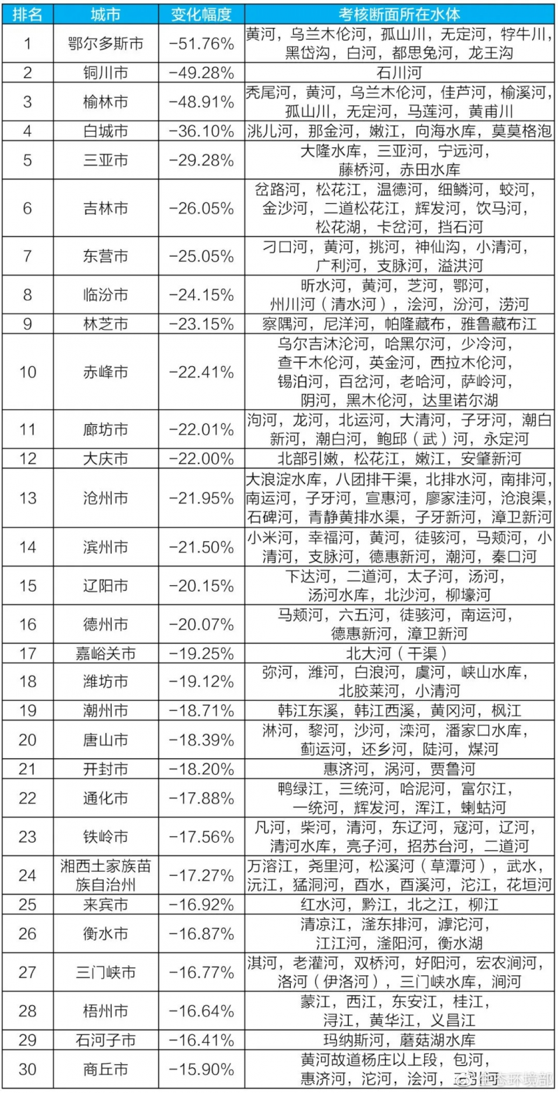 2021年1-6月国家地表水考核断面水环境质量变化情况排名前30位城市及所在水体