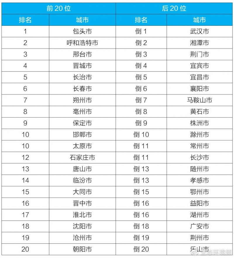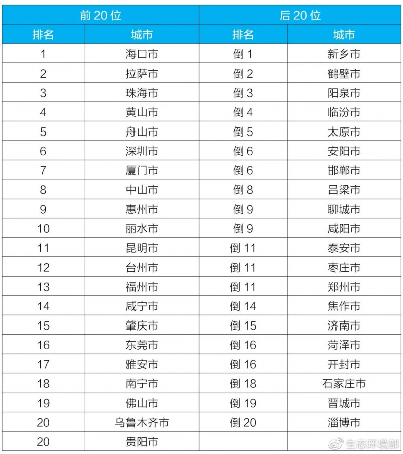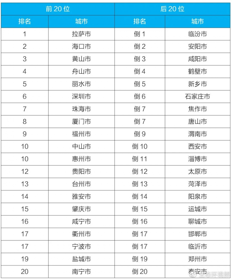 2021年6月168个重点城市空气质量排名前20位和后20位城市名单