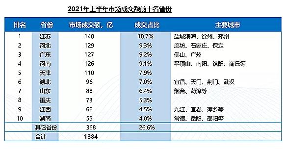—上半年29个省份有成交额,排名前十省份占总成交1016亿,占70%以上