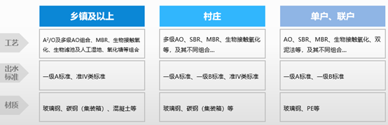 目前村镇污水处理所采用的技术、工艺等类型较多,可以分为乡镇及以上、村庄、户三种类型。