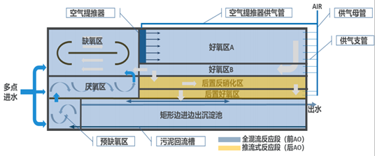 创新点1:空气提推实现高回流比。5~10倍大回流比,提高系统抗冲击负荷,无回流泵,节能降耗。