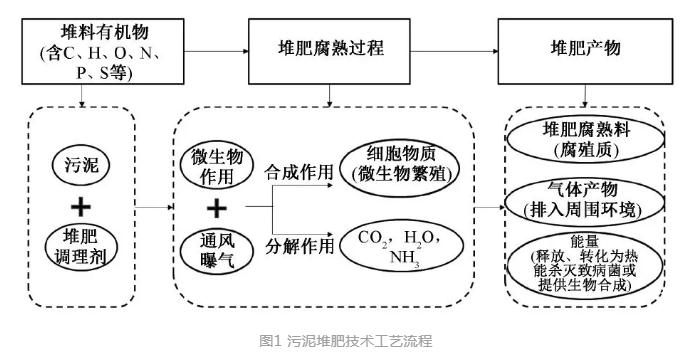 堆肥技术是一项成熟且简单有效的技术,是在有氧条件下通过好氧微生物的生命活动,将堆料中的不稳定有机质转化为较稳定有机质,同时降低挥发性有机质含量、消除臭气的过程,其主要工艺流程见图1。目前对于污泥堆肥技术的控制因素受普遍认可的有通风量、含水率、温度、pH值和碳氮比(C/N)。通风量、含水率、C/N 为堆肥腐熟过程中微生物的生命活动提供必要的原料,温度及pH 值影响着微生物的活性。