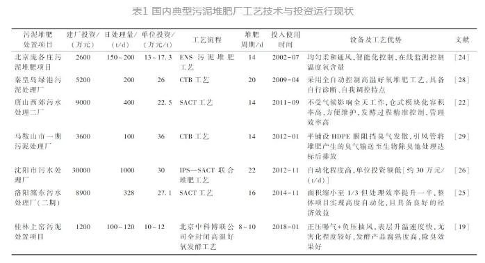 目前,国内的污泥处置项目规模较小,大部分项目污泥日处理量在500 t 以下。《国家城镇污水处理厂污泥处理处置污染防治最佳可行技术指南》指出投资成本与系统的构成、污泥性质、自动化程度、设备质量等因素相关,“一般情况下,设计完整的污泥好氧发酵系统的投资为30万~ 50 万元/ t(含水率80%) ”。表1 中所有污泥处置项目的投资额均能满足技术指南的推荐值,并在设备工艺优化的投资上存在富余空间。