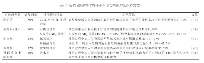 惰性调理剂指本身不含参与堆肥微生物生命活动的可降解有机质,其主要作用是增加堆体孔隙率,提升氧气传质效率,同时减少臭气释放。常用的惰性调理剂有沸石、浮石、碎轮胎等。表2列出了目前在污泥堆肥中采用的惰性调理剂及其对堆肥过程的优化效果。惰性调理剂对于污泥堆肥的有机质降解、腐殖质生成、微生物繁殖以及营养元素的保存等方面均有显著优化,其调配与添加是污泥堆肥技术发展与应用过程中必须重视的环节。