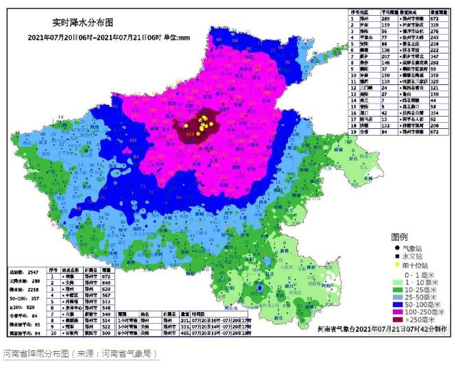 根据中央气象台的数据,17日8时至21日8时,河南省平均降雨量达144.7mm;郑州市平均降雨量458.2mm,郑州新密市白寨累计降雨量最大达918.9mm,郑州国家级气象观测站772mm,部分地区累计降雨量已超当地年平均降雨量(郑州全年平均降雨量641mm)。从短时降雨强度看,郑州、开封等多地1小时降雨量超过100mm,其中郑州气象观测站最大小时降雨量达201.9mm(20日16时-17时),突破中国大陆小时降雨量历史极值(198.5mm,河南林庄,1975年8月5日)。郑州局地3小时最大降雨量达333mm。