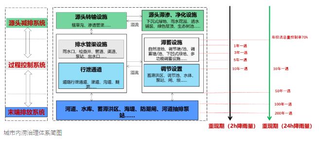 任何工程都有对应的设计规模,以极少数极端条件作为设计条件的经济合理性会严重不足,目前城市的内涝防治体系主要包括:源头减排系统、排水管渠系统、排涝除险系统和超标应急系统。