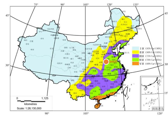 《海绵城市建设技术指南》将我国大陆地区大致分为五个区,并给出了各区年径流总量控制率α的最低和最高限值,即I区(85%≤α≤90%)、II区(80%≤α≤85%)、III区(75%≤α≤85%)、IV区(70%≤α≤85%)、V区(60%≤α≤85%),如下图所示。