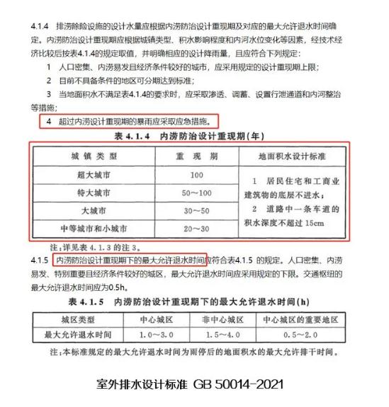 类似的观点显然有失偏颇,对城市排水系统以及海绵城市稍有了解的人都知道,此次河南遭遇的大雨灾害非常罕见,一天降了去年全年1/3的雨量,已经远远超出了城市排水能力所能应对的范畴,与是否建设海绵城市没有实质性的关系。根据查阅的相关资料,郑州城区的内涝防治设计重现期也和《室外排水设计标准 GB 50014-2021》中城市规模设定值相匹配,无论从城市规划还是工程设计角度而言,都是合乎标准的。