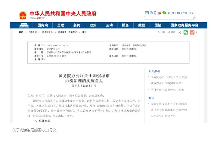 2021年04月发布的《国务院办公厅关于加强城市内涝治理的实施意见》(国办发〔2021〕11号)就已经提出:在超出城市内涝防治标准的降雨条件下,城市生命线工程等重要市政基础设施功能不丧失,基本保障城市安全运行。