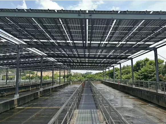 长善垸污水处理厂分布式光伏发电项目采用新型“钢结构+预应力钢索”光伏支架形式。成功解决了污水处理池跨度大建设成本高、钢架易腐锈等难题,与传统钢架结构方案相比,新型支架具有用钢量少、跨度大、造价低、施工周期短等特点。钢结构及钢索都采用热镀锌工艺处理,满足在污水厂高腐蚀条件下支架25年以上防腐要求。