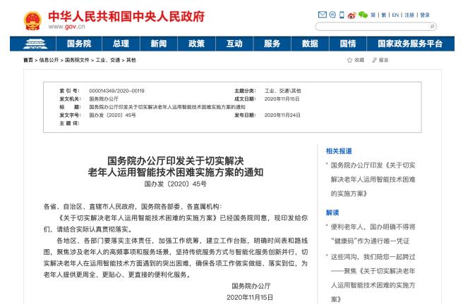 去年11月,国务院办公厅印发了《关于切实解决老年人运用智能技术困难实施方案》,就进一步推动解决老年人在运用智能技术方面遇到的困难,坚持传统服务方式与智能化服务创新并行,为老年人提供更周全、更贴心、更直接的便利化服务作出部署。