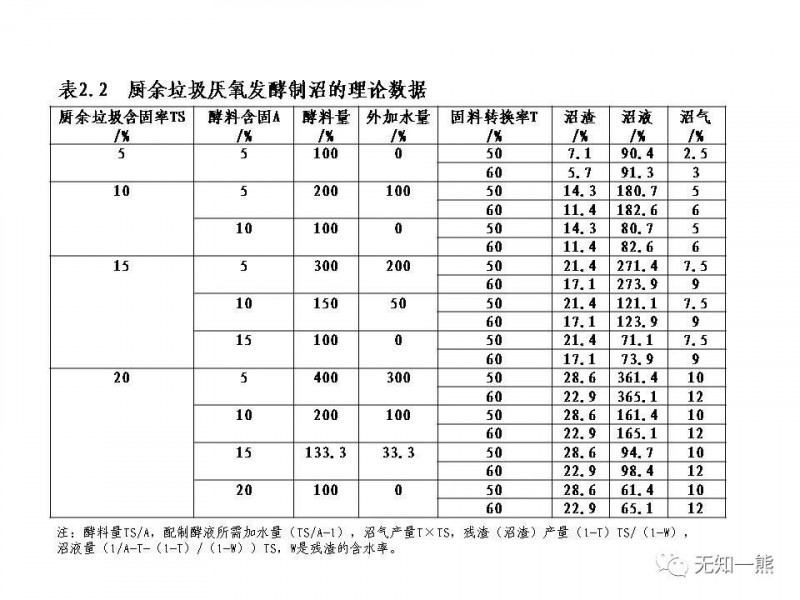 以厨余垃厌氧发酵圾制沼为例。厨余垃圾含固率的变化以及处理工艺技术引起的固料转换率、酵料含固率、残渣含固率等变化对沼气、残渣、沼液产量影响很大,见表2-2。测算时,假定残渣的含固率为35%(含水率65%),不考虑有机反应对物料平衡的影响。