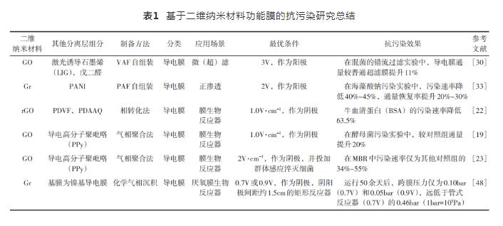 传统膜材料的抗污染性能优化主要是通过对膜材料表面或孔道内亲疏水性、zeta电位以及粗糙度的调控实现的,而功能膜材料(以导电膜为主)的抗污染性能主要依靠静电排斥作用、电化学氧化还原以及在较大电压时的电致气泡对膜表面的冲刷作用使污染物在膜表面、孔内沉积速率降低,从而降低清洗频率,延长膜的使用寿命。图3总结了导电膜作为阴极或阳极时可能发生的电化学过程,并给出了几个典型反应的标准电极电势。在中性条件下,许多有机污染物、微生物表面均带负电,因此抗污染功能膜材料往往被用作阴极材料。此时,功能膜整体带负电,静电排斥发挥主要作用,降低微生物和有机物在膜面附着的倾向。且在电势低于一定值时,可通过将水中的溶解氧在功能膜上还原为双氧水(H2O2),进而氧化膜表面或孔内的部分有机污染物或微生物。而当电势低于析氢电位时,氢气的产生也可能会起到冲刷膜表面的作用,进一步强化抗污染能力。当功能膜被用作阳极材料时,主要依靠电极氧化能力直接电子传递或产生ROS(如·OH)氧化污染物或微生物,以及在高电势时析氧反应对膜面的冲刷作用。表1总结了近年来基于二维纳米材料的功能膜在抗污染中的研究进展。