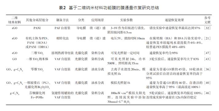 膜通量恢复主要是指膜发生污染后,在外界能量输入条件下使膜通量恢复的自清洁过程。导电膜主要依靠电氧化和电致气泡实现膜通量的恢复;而光催化膜主要依靠可见光或紫外光照射,产生ROS降解表面和孔内沉积的有机物,实现膜通量的恢复。表2列举了近年来基于二维纳米材料的新型功能膜在膜通量恢复中的研究现状。