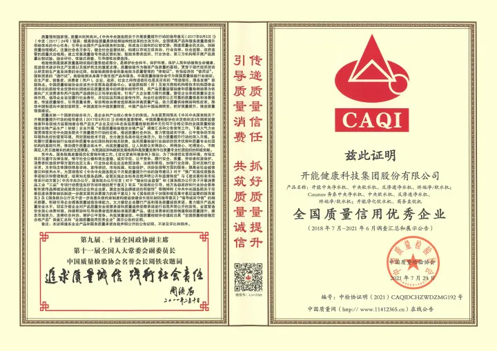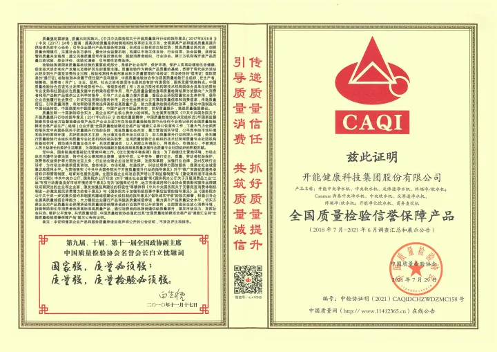 作为美国水质协会会员,开能健康产品通过了美国NSF、欧盟CE、德国W270等多项安全及环保认证,并连续多次被评为上海市高新技术企业,上海民营企业百强、上海市浦东新区环保诚信企业、中国质量诚信企业、上海市第八届优秀公共关系案例评选活动金奖等系列荣誉。在质量变革大潮中,为新时代制造高质量产品发展做出积极贡献。