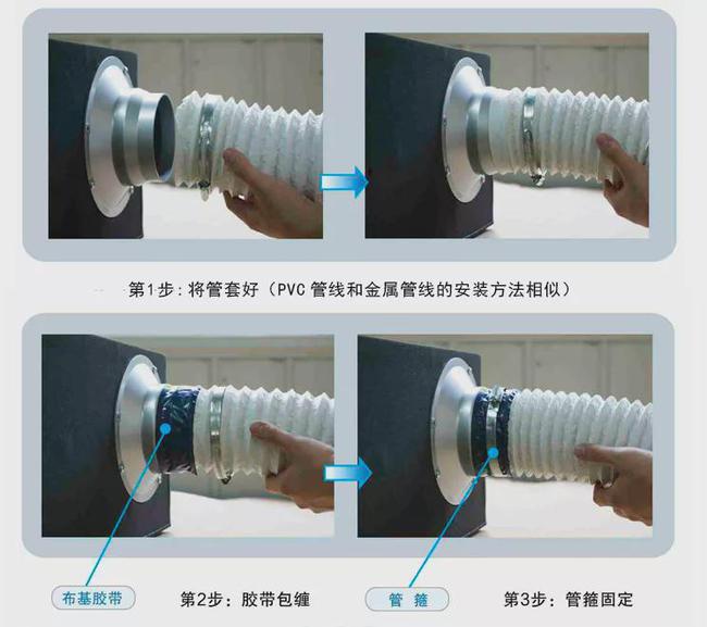 消音管在安装方式上采取快插式安装的法兰处理,管箍+布基胶带相结合方式,避免漏风。