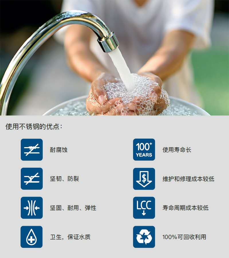 不锈钢在水中不活跃,它是卫生的,因此可以输送安全、高品质的饮用水,也适合盛装各种饮用水。由于不锈钢坚固而具有弹性,因此可以在干管压力下降且液压完整性丧失时防止化学和细菌污染物通过管道裂缝进入水中。