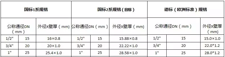 正常情况下一般是这样采用的:工程一般采用国标1系,家装一般采用日本标准也就是国标2系,316L的不锈钢一般采用着德国标准,薄壁不锈钢的三个标准的表格如下: