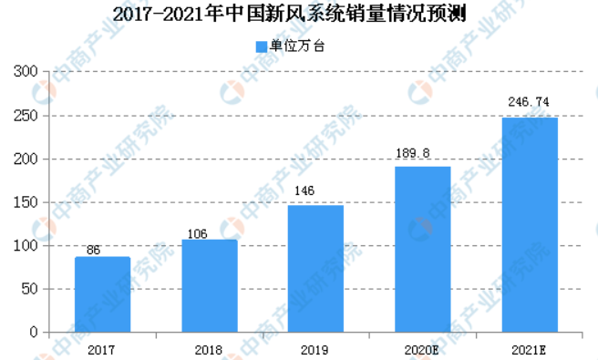 随着经济发展,以及民众对空气质量的关注和认知逐步提升,中国新风行业的产值也在快速增长。消费者认知的提升以及各品牌渠道战略的成熟,房地产精装修、校园和线上零售为市场注入新的增量,成为支撑新风市场规模持续增长的关键渠道。据数据显示:2019年新风系统在地产精装修渠道的配置量已经达到88.4万套,同比增长18%。2019年新风系统线上市场的销售规模继续保持较高速增长,据奥维云网统计,我国新风系统的市场规模持续扩张,2017-2019年销售数量分别为86万台、106万台、146万台,复合增长率超过30%,据中商产业研究院预测,2021年我国新风系统销量将达246.74万台。