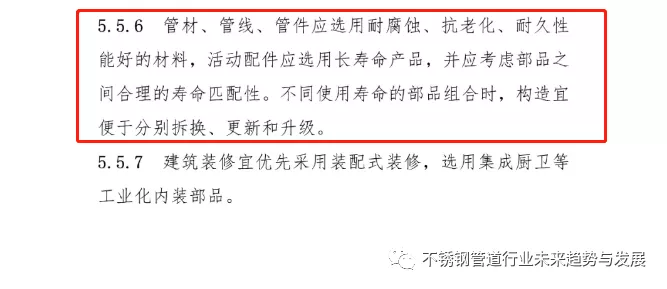 5.5.6 管材、管线、管件应选用耐腐蚀、抗老化、耐久性能好的材料,活动配件应选用长寿命产品,并应考虑部品之间合理的寿命匹配性。不同使用寿命的部品组合时,构造宜便于分别拆换、更新和升级。
